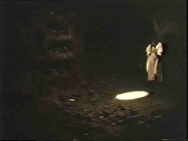 Here the true builders of Metropolis rest forever. There appears to be a network of tunnels further in the dark. Maria is followed by a spotlight-- she turns to flee in the tunnels.